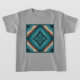 Ein symmetrisches geometrisches Muster in quadratischem Format mit aquamarinem und kupferfarbigem Schema. Das Zentrum verfügt über eine große, rautenförmige Medaille mit aufwändigen Linienarbeiten und einem kreisförmigen Sonnenburstmuster im Inneren. Das Medaillon ist von vier kleineren diamantenförmigen Rahmen mit verzierten Grenzmustern umgeben. Der Hintergrund strahlt einen Sonnenbursteffekt aus, der von der Mitte ausgeht und ein dynamisches Bewegungsgefühl schafft. Der äußere Rand besteht aus zackigen, säzahnähnlichen Spitzen in Kupfertönen vor dem aquamarinen Hintergrund. Das gesamte Design ist durch einen dünnen gepunkteten Linienrand eingeschlossen. Die Farbpalette wechselt von tief aquamarin in der Mitte zu helleren türkisfarbenen Tönen in der Nähe der Kanten, mit Kupferakzenten in den Spitzen und dekorativen Elementen. Das Muster hat mit seinen geometrischen Formen und strahlenden Motiven einen amerikanischen oder südwestlichen Gestaltungseinfluss.