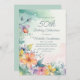 Hübsche aquamarine, gelbe und rosa Aquarellpastellfarben Blume 50. Geburtstagsfeier Einladung für Frauen. Text, Schriftart und Wortlaut sind vollständig anpassbar, sodass diese Karte, obwohl sie für eine Dame konzipiert ist, die ihren 50. Geburtstag feiert, für jedes Alter angepasst werden kann. Kontaktieren Sie uns für Hilfe bei der Anpassung oder um passende Produkte anzufordern.