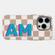 Moderne Aquamarine und Hot Pink Shadow Mit Monogramm Personalisierte Vertikale Große Erstklassiges Schachbrett iPhone 16 Pro Case - Dieses trendige, braune und beige Schachbrett Gehäuse hat große aquamarine und heiß rosa vertikale Schattenmonogramm auf der Seite, die Sie anpassen können, um dieses Gehäuse zu Ihrem eigenen machen.