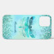 Stilvolle iPhone-Gehäuse, mit grafischen Kunstwerken eines aquamarinen abstrakten Libellen und aquamarinen Imitat-Glitzer vor einem leichten aquamarinen Aquarellhintergrund. Personalisieren Sie den aquamarinen Text für eine ganz besondere Geschenkidee für sie.