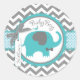 Aquamariner Elefant mit Bugs-Krawatte und auf Schulter aufgehängtem Vogel und Zickzack, grau-weißer Druck mit 3D-Look Bändchen Babydusche Geschenketikett.