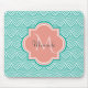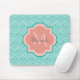 Ein elegantes Mousepad mit aquamariner, grüner Deko-Fischskala mit einem hellrosa QuatrefolienAbzeichen, das Sie ganz einfach mit Ihrem Monogramm und Namen personalisieren können. Dies ist Teil der Arcadia Fishcale Blooming Dahlia Monogram Spring Collection.