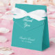 Eine einfache aquamarine Gastgeschenk Hochzeit. Die Meldung Dankeschön auf der Klappe (und darunter) und die Namen (auf der Vorderseite, im unteren Teil) sind in eleganter Kalligrafie geschrieben und das Datum in kleineren Ziffern unter dem Namen. Der gesamte Text ist weiß und kann geändert werden.