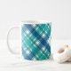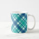 Diese Tasse zeichnet sich durch ein trendig aquamarines und dunkelblaues diagonales kariertes Muster aus. Eine weiße Rautenform in der Mitte bietet ein individuelles Monogramm.