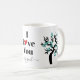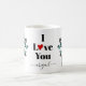 Leichte aquamarine und schwarze Liebesvögel Sakura Kirschbaum und Blüte Kaffee Tasse. Ein personalisierter Schlamm mit dem Satz "I Liebe You", mit einem roten Herz anstelle des Buchstabens "o" und benennen Sie das perfekte Geschenk für den Valentinstag.