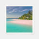 Paper napkins with a beautiful photograph. A scenic tropical beach with aquamarine water and a white sandy beach with a lush forest in the back.