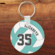 Dieser personalisierte Volleyball-Schlüsselanhänger verdoppelt sich während der Volleyballsaison als Duffel- oder Rucksack-Anhänger mit leicht anpassbarem Spielernamen und Jersey-Nummer - die Hintergrundfarbe der nicht weißen Volleyballfelder kann in eine Lieblingsfarbe oder Teamfarbe geändert werden, hier in aquamarinem Licht dargestellt - von katz_d_zynes