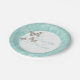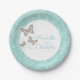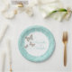 Schöne drei grafische Schmetterlinge und blühende Teller aus Papier in Aqua aquamarin, Creme, Rosa und Braun. Eine großartige persönliche Ergänzung zu Ihrem Hochzeitsbuffet oder für Hochzeitsfeiern. Personalisieren Sie Ihre Namen. Ideal für Schmetterlingsthemen oder Gartenhochzeiten oder Liebhaber von Wildtieren. Einzigartig bedrucktes Frack, gemalte Dame und fritlige Schmetterlinge Kunst und stilvolle grafische wilde Blume Aqua Damask Design von Sarah Trett.