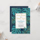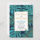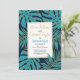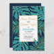 Aquamarine, marineblaue und goldene tropische Monstera und Palmen Blätter Engagement Party Einladung, die ein Muster tropischer Blätter in aquamarinem Blau mit goldenen Kontur auf marineblau Hintergrund und Ihren Text in einem weißen Rahmen. Auf der Rückseite befindet sich ein goldenes Punktmuster auf blauem Hintergrund.