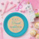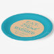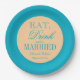 Aquamarine und pfirsichfarbene trendige Papier Hochzeitsfeiern Teller. Elegante kleine oder große Teller für Hochzeitsfeiern. Klassisches Typografie-Design mit stilvollen Skriptbriefen und formellen Schriftart. Personalisiert mit dem Namen der Braut und des Bräutigams plus dem Datum der Ehe. Iss etwas und sei verheiratet. Die Farbschattierkombination kann nach Ihrem Schema geändert werden.