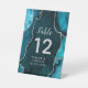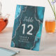 Dieses elegante und glamouröse Hochzeitszeichen der Tischnummer besticht durch einen aquamarinen marmorfarbenen Hintergrund mit Imitaten, die auf silberne Glitzer hinweisen. Der Text kombiniert handgeschriebene Skripte mit modernen serifenlosen Schriftart für ein elegantes und raffiniertes Aussehen. Dies ist perfekt für Herbst- und Winterhochzeiten.