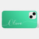 Aquamarine Shimmer White Elegant Calligraphy Script Custom Personalisiert Name iPhone 14 Smart Phone Cases zeichnen sich durch ein modernes und trendiges, einfaches und stilvolles Design aus, mit Ihrem personalisierten Namen in elegantem handgeschriebenem Schriftzeichen Typografie auf metallischem Aquamarine-Schimmer-Hintergrund. Entworfen von ©Evco Studio www.zazzle.com/store/evcostudio