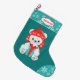 Ein bezaubernder kleiner, weißer Eisbär trägt eine rote Strumpf-Kappe und hält ein aquamarines und rot verpacktes Geschenkpaket an der Vorderseite dieses niedlichen Kinderbärchens Strumpf. Das Bild wird auf einem aquamarinen Hintergrund platziert und ein aquamariner und weißer Schneeflockenmuster-Rahmen oben und auf dem Zehen. Der Name Ihres Kindes ist auf einem rot gesäumten weißen Banner am oberen Rand des Musters der Schneeflocke. Die Rückseite des Strumpfs ist das gleiche aquamarin-weiße Schneeflockenmuster. Niedlich!