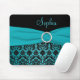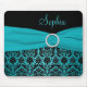 Dieses elegante Schauen aquamarines und schwarzes Damast mousepad hat eine zusammenpassende Imitatband- und -kristallbrosche. Fertigen Sie es mit Ihrem eigenen Namen, Monogramm oder anderem Text besonders an.