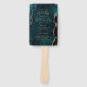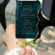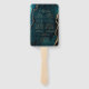 Dieser elegante, moderne Hochzeitsfan besticht durch einen aquamarinen, blauen Hintergrund mit vergoldetem Imitat-Glitzer. Der Text erscheint in goldfarbenen Handschriften und Schriftart mit Copperplate.