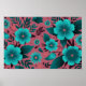 Aquamarines Blumenmuster auf Maroon-Hintergrund Poster