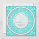 Haupteinladung in aquamarinem für das Blumen duschen rund um die Uhr Reihe. Ein silbernes Ziffernblatt ist der Schwerpunkt des Entwurfs. BlumenSilhouetten umgeben es und addieren ein weiches, Brautmotiv. Wählen Sie von drei verschiedenen Hintergrundfarben: aquamarin, rosa oder lila. Mit der mutigen Uhr und den hellen Farben verwechselt niemand das Thema der Dusche!