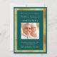 Eine elegante, moderne, einfache Geburtstagseinladung. Ein aquamariner, grüner Hintergrund mit vergoldeten Imitaten. Personalisieren und fügen Sie einen Namen und Details des Fotos hinzu. Goldener Text.