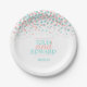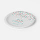 Schöne stylisierte Grafik Konfetti verstreuten Punkte fügen Ihre eigenen Hochzeitnamen und Hochzeitstag Papier Teller. Eine großartige persönliche Ergänzung zu Ihren Hochzeitstischen oder nach einem Hochzeitsdrink oder einer Hochzeit nach dem Party. Personalisieren Sie die Namen Ihrer Braut und Bräutigam. Ideal für Hochzeitsfeiern, Verlobungen oder Jubiläen mit einem orangefarbenen Korallenrot und aquamarinem Aqua-Blau. Originale Kunst und Design von Sarah Trett für www.mylittleedenweddings.com