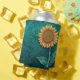 Eine lebendige Sonnenblume mit einer hellgelben Blütenwand und einem runden braunen Zentrum. Die Sonnenblume befindet sich auf der rechten Seite des Bildes. Um die Sonnenblume herum ist ein detailliertes, verziertes Design in einem türkisfarbenen Hintergrund geschnitzt. Dieses Design besteht aus komplexen Wirbel und Mustern, die Blumenmotiven ähneln. Der Stamm und die Blätter der Sonnenblume sind ebenfalls in einer ähnlich türkisfarbenen Farbe dargestellt, was einen harmonischen Kontrast zu den gelben Blüten bildet.