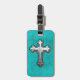 Silbernes Metallkreuz auf einem aquamarinen ledernen Hintergrund
