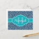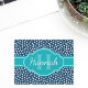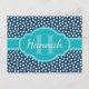 Stilvolles, trendiges, dunkelblau-weiße Punktmuster im Hintergrund, ergänzt durch ein aquamarines, helles blaues Label mit individualisierbarem Namen und Monogramm-Vorlage.