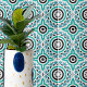 Moderne Keramik-Kacheln mit einem nahtlosen Muster aus geometrischen Formen in aquamarin, schwarz und weiß.