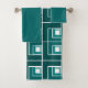 Dieses Handtuchhandtuch Set hat ein aquamarines Waschlappen, ein leichteres aquamarines Handtuch und ein Badehandtuch mit geometrischem Design aus Ls in aquamarinen Farbtönen, die in verschiedenen Richtungen angeordnet sind und sich über das Design wiederholen.