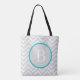 Trage deine Sachen stilvoll mit einer Aquamarinen Zickzack Monogram Tote-Tasche, während du unterwegs bist. Das Design der Tote Tasche weist ein hellgraues Zickzack Muster mit einem in aquamarin umrissenen Kreisemblem auf. Weitere Artikel sind auch mit diesem Design erhältlich. Bitte kontaktieren Sie mich direkt für Hilfe bei der Personalisierung.
