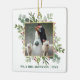 Eleganter Wintergarten Watercolor Mr. und Mrs. Wedding Foto Neuvermählte Weihnachtsschmuck beinhaltet Eukalyptus-Blätter und rote Heilige Beeren. Grüner Text. Goldrahmen.