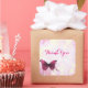 Ein schönes Dankeschön, dass Sie aufklebern. Ein wunderschöner lila Schmetterling, der Ihre Aufmerksamkeit auf sich zieht. Set auf einem zarten Hintergrund mit einer einzigartigen und kreativen Aquarellstruktur mit romantischen rosa und gelb verblassten Blume.