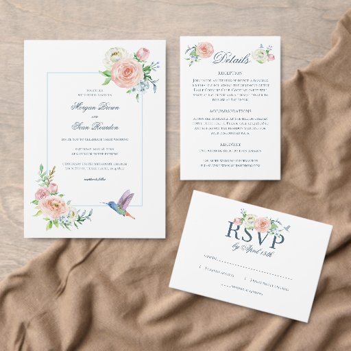 Setzen Sie den Ton für eine romantische, zeitlose Feier mit diesem Wasserfarben-Blumen-Hochzeitsdesign, das für Paare geschaffen wurde, die sanfte Eleganz und durchdachte Details lieben. Die Vorderseite zeigt zarte rosa und elfenbeinfarbene Blumen, gepaart mit anmutigem Grün, eingerahmt von einem sauberen, luftigen Layout, das sich sowohl klassisch als auch frisch anfühlt. Ein charmantes Wasserfarben-Kolibri-Motiv fügt eine subtile symbolische Note von Liebe, Freude und Neuanfängen hinzu.