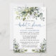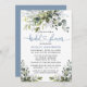 Die moderne Elegant Watercolor Botanical Greenery Bridal Shower Invitation Card beinhaltet Eukalyptus-Blätter, grünes botanisches Blattwerk, staubblaue Blätter und andere schöne botanische Pflanzen. Dusty Blue Back. Trendy Kalligrafie Script Herz.