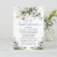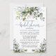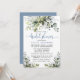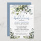 Die moderne Elegant Watercolor Botanical Greenery Bridal Shower Invitation Card beinhaltet Eukalyptus-Blätter, grünes botanisches Blattwerk, staubblaue Blätter und andere schöne botanische Pflanzen. Dusty Blue Back. Trendy Calligraphy Script
