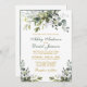 Die moderne elegante Botanische Grüne Hochzeitskarte bietet Eukalyptus-Blätter, grünes botanisches Blattwerk, staubblaue Blätter und andere wunderschöne botanische Pflanzen. Goldene Schrift, Foto Back