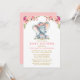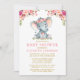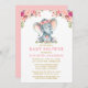 Aquarellfarben Rosa Blütenflora Elephant Baby Dusche Einladung. Freuen Sie sich auf schöne Rosen in Aquarellfarbe mit botanischem Grün. Gold Text.