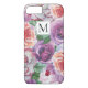 Rose für Aquarellfarben und Monogramm florale Case-Mate Barely There iPhone 8/7 Fall. Es zeigt ein Muster von Vintagen Rose in lila und Korallen und Ihr Monogramm in einem weißen Rahmen.