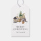 Diese gemütlichen, rustikalen Geschenktafeln zeigen eine Aquarellillustrierung einer niedlichen weiblichen Gnome, die neben einem Miniatur-Weihnachtsbaum sitzt, einen Korb aus Birkenholz und ein paar Kerzen. Die Wörter "MERRY CHRISTMAS" erscheinen in grauen Serifenbriefen, die sich mit der Kunst abstimmen.