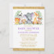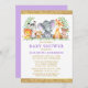 Watercolor Safari Animals Greenery Baby Shower Einladungskarte. Zu den Kleinkindern zählen Elephant, Monkey, Giraffe, Rhino, Zebra und Lion auf Farn-Blätter. Botanische Vegetation in Aquarellen. Gold Text, Gold Glitzer. Lila Violett zurück.