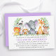 Watercolor Safari Animals Greenery Baby Shower Einladungskarte. Zu den Kleinkindern zählen Elephant, Monkey, Giraffe, Rhino, Zebra und Lion auf Farn-Blätter. Botanische Vegetation in Aquarellen. Lila Violett zurück.