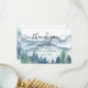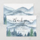 Elegante rustikale Aquarell-Berge und Waldszene-Hochzeit-Dankeskarte, mit üppigen blauen und grünen Bäumen und Bergen mit einem Schrifttext: Lass das Abenteuer beginnen. Für diejenigen, die eine romantische träumerische Waldatmosphäre für ihre Zeremonie und Feier lieben.