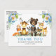 Watercolor Woodland Tiere Blue Floral Baby Dusche Danke Postcard. Zu den Kleinkindern zählen Bären, Hirsche, Elche, Raccoon, Kaninchen, Fox und Eule im Wald. Freuen Sie sich auf wunderschöne, blau-weiße Blume mit botanischer Vegetation und Farnen.