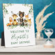 Watercolor Woodland Tiere Baby Dusche Begrüßungtisch Schild. Zu den Kleinkindern zählen Bären, Hirsche, Elche, Raccoon, Kaninchen, Fox und Eukalyptus-Blätter und Waldpflanzen.