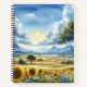 Dieses Notebook hat zwei Aquarellbilder in einem Notebook. Die Vorderseite hat eine Naturlandschaft mit Sonnenblumen. Der Rücken hat ein Rentier auf einem Felsen.