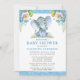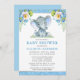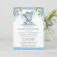Watercolor Blue Floral Baby Elephant Baby Dusche Einladung. Freuen Sie sich auf wunderschöne, blau-weiße Blume mit botanischer Vegetation und Farnen. Blauer Glitzer und Silberrahmen.