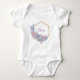 Dieser wertvolle Bodysuit für ein kleines Mädchen hat einen doppelten goldenen Drahtrahmen mit einem Blumenstrauß aus lila und blauen Blumen in Aquarellen. Innerhalb des Rahmens personalisieren Sie mit dem Namen Ihres Mädchens.
