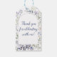 Ein Sortiment von blau-tonalen Aquarellfarben und Grün bildet den Hintergrund für dieses Geschenkschild. Ein idealer Weg, um sich bei den Gästen zu bedanken, die an einer Wildblume- oder Boho-Bridal, einem Ehepaar oder einem Polterabend teilnehmen, aber Sie können sie für eine Verlobungsfeier, Jubiläumsfeier, Babydusche oder Geburtstagsparty anpassen. Verfügbar mit passenden Produkten.