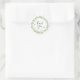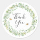 Ein runder Aufkleber mit dem Text Dankeschön, mit einem hübschen Blattkranz in sanften Grüntönen und kleinen Honigbienen, alles in Aquarell. Koordiniert wunderschön mit unseren Baby Dusche Einladungen und mehr. Ideal für Taschen mit Gefallen.