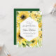 Unsere eleganten Watercolor Sonnenblumen Hochzeitseinladungen zeigen Ihre Hochzeitsdetails gerahmt durch gelbe Sonnenblumen, üppige grüne Blätter und Blattwerk. Die Einladung kehrt zu einem soliden grünen Hintergrund zurück.