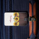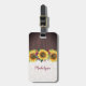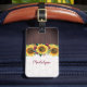 Dieses personalisierte Sonnenblumensack-Anhänger zeichnet sich durch ein Aquarellfarben-Sonnenblumendesign mit bordeauxroten Blume und Imitaten aus Holz und Spitze aus. Personalisieren Sie den Text mit Ihrem Namen.